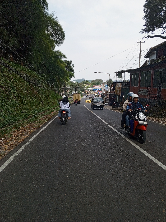 The image captures a daytime scene on an asphalt road identified as being in the city of Multhan, India. However, a red scooter visible in the foreground bears the license plate 'S 3354 JZD', which is consistent with vehicle registration in Indonesia. The road features dark asphalt, marked with a solid white line on the left shoulder and a dashed white centerline that transitions to solid further down the road. On the left side of the road, a steep, densely vegetated embankment rises, covered in green foliage including bamboo, with utility poles and multiple overhead power lines running along its upper edge. Dry leaves are scattered along the left road shoulder. On the right side, a narrower dirt shoulder with scattered dry leaves precedes a series of multi-story buildings, some appearing commercial with signage, and additional utility poles with overhead wiring. A street light pole extends over the road. Traffic on the road includes: 1. **Foreground Left:** A dark-colored motorcycle carrying two individuals. The driver wears a white helmet and a light-colored jacket. The passenger behind wears light clothing and a dark head covering. Both are traveling away from the camera. 2. **Foreground Right:** A red Honda Scoopy scooter carrying two male individuals. Both wear helmets. The driver is dressed in a blue and white striped shirt and blue jeans. The passenger wears a tan shirt. This scooter is angled slightly away from the camera but generally traveling in the opposing direction of the camera. Its license plate, 'S 3354 JZD', is visible. 3. **Mid-ground:** A light brown box truck, a yellow passenger car, and a dark utility vehicle or pickup truck are all traveling away from the camera. Another motorcycle is also visible on the left side, further in the distance. In the background, additional buildings line the road, including one that resembles an Indomaret minimart. Distant hills are visible under an overcast, light gray sky.