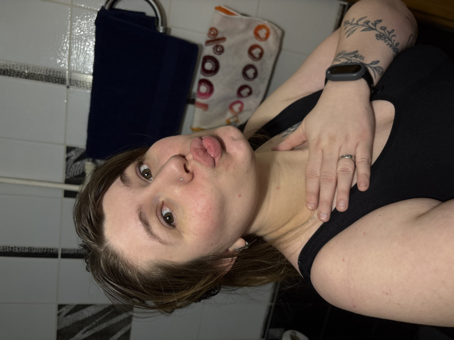 The image portrays a female individual in an indoor setting, identified as located in Chaikovsky, Russia. The scene appears to be a bathroom, evidenced by tiled walls and hanging towels. The subject, an adult female, is shown from the chest up, positioned slightly off-center and looking directly at the viewer. Her medium brown hair has some lighter strands near the roots and appears swept back. Her lips are pursed in a "kissing" pose, and a small, silver-colored stud piercing is visible on her right nostril. A faint yellow-purple discoloration is present below her left eye. She wears a black tank top, a thin silver-colored chain necklace, and a small silver-colored hoop earring in her visible left ear. Her right hand, adorned with a plain silver-colored ring on the ring finger, is placed on the left side of her neck/upper chest. Her left forearm, visible on the left side of the frame, features a tattoo consisting of leafy or floral patterns, and a dark-colored smart watch with a dark screen is worn on her left wrist. The background features white rectangular wall tiles interspersed with vertical decorative bands of patterned, possibly darker-toned, tiles. A chrome towel rail holds a folded dark blue towel, and below it, a white towel with colorful circular or heart-shaped patterns is draped.