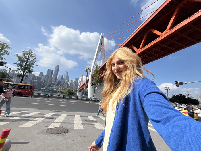 The image depicts an outdoor urban street scene under a bright, clear blue sky with scattered white clouds, located in Nan'an District, China. In the immediate foreground, a female with long, wavy, light reddish-blonde hair and a slight smile faces the camera, extending her right arm to capture a selfie. She is wearing a blue button-up cardigan over a light-colored top. The mid-ground features a wide asphalt road with a clearly marked white-striped crosswalk and visible manhole covers. To the left, a red public transit bus with Chinese characters is either stationary or moving slowly, near which a female pedestrian in a light pink shirt and blue jeans walks leftward across the road. Directly beyond the road, a wide body of water is implied by the distinct high-rise city skyline of the Yuzhong District, visible across the water. Overhead, dominating the upper mid-ground, is the prominent red-orange steel truss structure and white cable-stayed pylon of the Qianximen Bridge. To the right of the central figure, a black traffic light pole with multiple signals is visible, along with a partial view of a yellow taxi and other distant pedestrians on the roadside. Green trees line sections of the road.