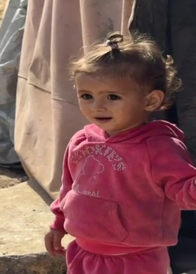 A young child with fair hair, pulled up into a small ponytail at the top of their head, wearing a pink hooded sweatsuit with white embellishments and a kangaroo pocket stands outside what appears to be a tent or makeshift shelter. The child is facing slightly to the right and is looking and smiling towards the left. The ground is dirt and debris is scattered around. The background is slightly blurred and shows other tents and people in the distance.