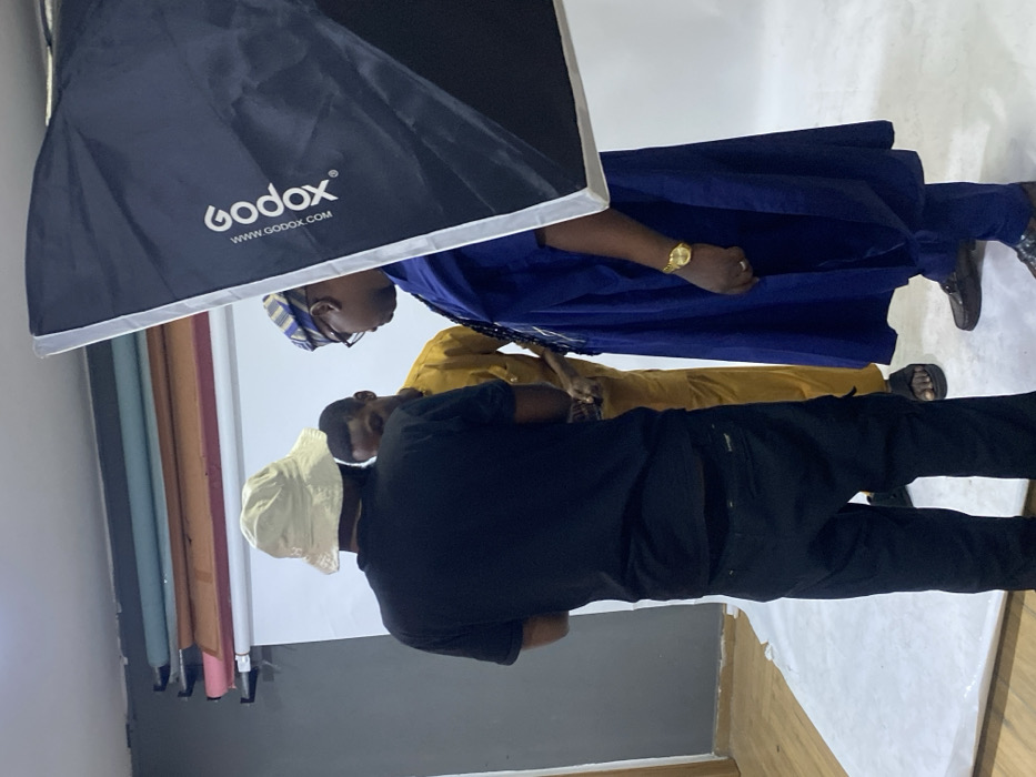 A photographer in a black outfit and a white bucket hat is taking a picture of two men. One man is wearing a blue robe, a gold watch, and a traditional Yoruba cap. The other man is wearing a yellow outfit. A large Godox softbox light is visible on the upper left. The scene is set up in a studio with white and grey backgrounds and multi-colored paper backdrops.