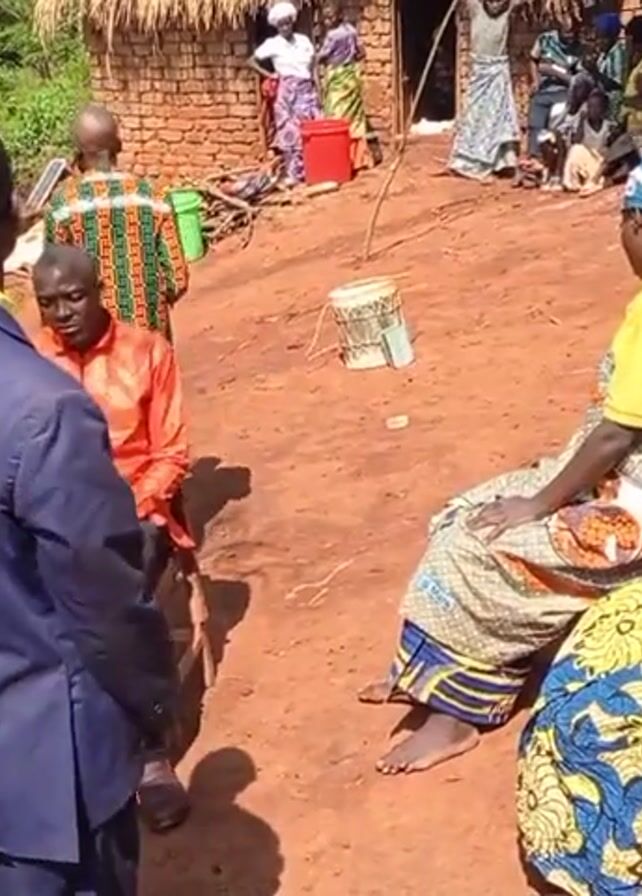 A small group of people gather on a reddish dirt field. A man in a blue suit stands, extending his arm upward as he appears to speak to two women sitting on yellow chairs. One woman is wearing a yellow shirt and blue head wrap, while the other is wearing a green head wrap and a patterned top. To the left, a group of men are seated near a leaning piece of wood, with one holding a blue bucket. Another man in an orange shirt sits on a wooden stool between the standing man and the seated women. In the background, a crowd of people stands near a brick building with a thatched roof. A small drum sits on the ground nearby.