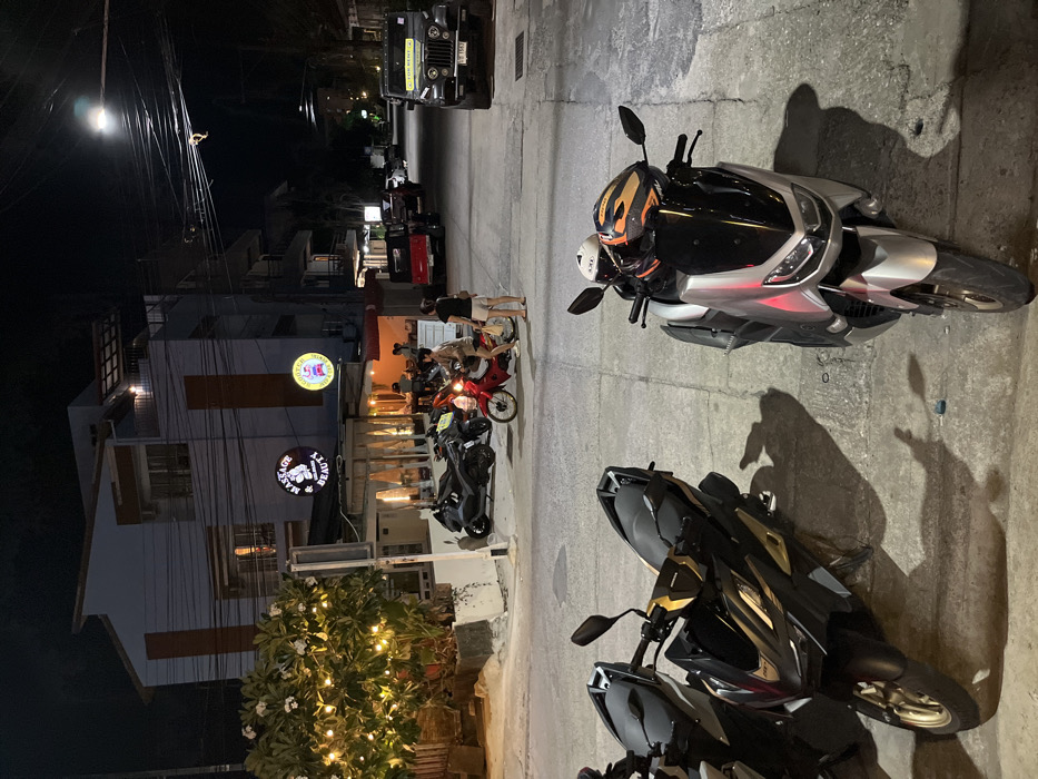 Night street scene shows parked motorcycles and mopeds, some with helmets, along a sidewalk. Several people stand near a lit business with signage. Vehicles are also parked in the street, including a Jeep. A tree with small lights and surrounding buildings are also visible. The image has a rotated perspective.