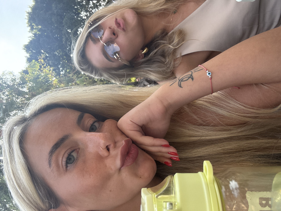 Two young adult females are depicted in a selfie-style photograph taken outdoors in Herzliya, Israel. The subject on the left, in the foreground, has long blonde hair, light skin with visible freckles, blue eyes, and a nose piercing. Her left hand is positioned near her chin, revealing red nail polish on her fingers. A tattoo, resembling a stylized double 'C' or crescent, is visible on her right forearm, along with a red string bracelet featuring a blue evil eye bead and a silver bead. She exhibits a puckered lip expression. A translucent yellow water bottle is partially visible in the lower-left. The subject on the right, in the background, also has blonde hair and wears rimless, light-colored sunglasses with gold-toned frame accents. She mirrors the puckered lip expression and wears a gold-toned hoop earring on her visible ear. Her top appears light-colored, possibly beige, with a V-neckline. The background consists of blurred green foliage and a bright sky, indicating a daytime outdoor setting such as a park or garden.
