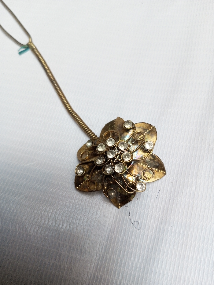 A tarnished, brass-colored, flower-shaped metallic ornament, approximately 5 cm in diameter, is depicted resting on a textured white surface in Qarabucaq qəsəbə, Azerbaijan. The ornament features five primary petals, each embellished with small raised dots and intricate wire detailing. The center of the flower and several points on the petals are set with clear, circular, faceted rhinestones, with some settings appearing vacant. A thin, gold-toned serpentine chain extends from the top of the ornament, exhibiting a small, light-blue fibrous tag or thread near its attachment point. Several dark, fine strands of material, consistent with human hair, are present on the white surface below the ornament's right side. The overall condition indicates wear and tarnishing on the metallic components. No individuals are present in the frame.