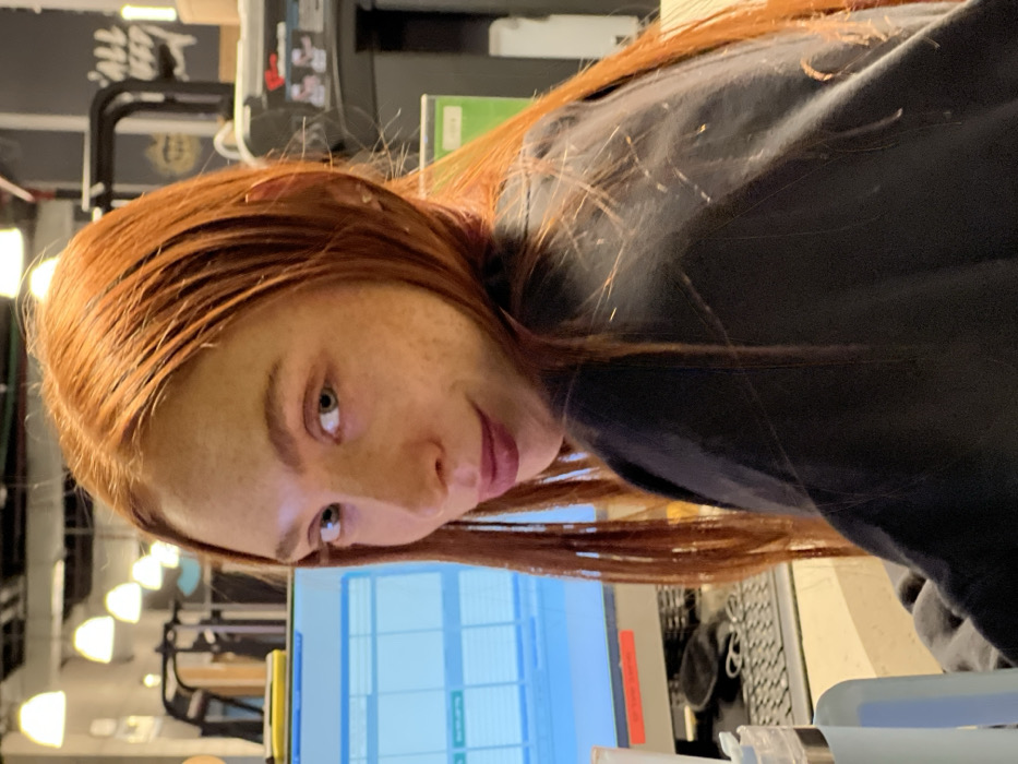 A young woman with vibrant red hair and freckled skin gazes at the camera with a slight smile. She has green eyes and is wearing a black sweatshirt. In the background, a computer monitor displays a grid, likely a spreadsheet. Gym equipment and a row of lights are visible in the blurred background, suggesting the photo was taken in a fitness facility.