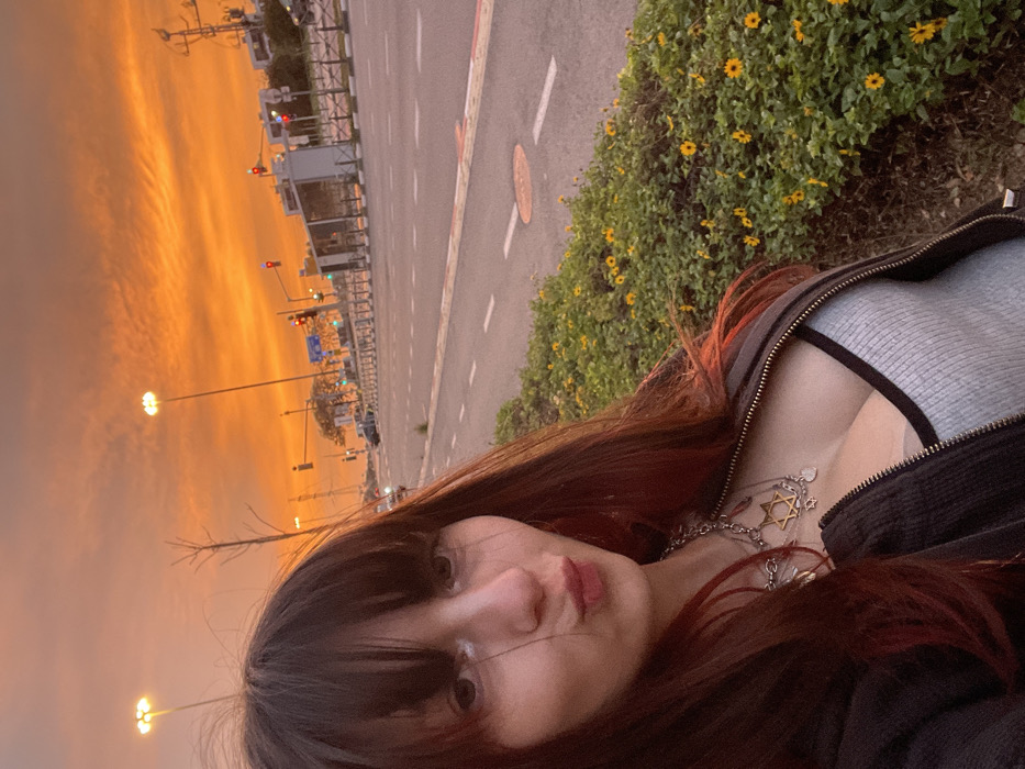 A person with dark hair and bangs poses for a selfie. They are wearing a gray top and a black zippered jacket. A necklace with a Star of David is visible. The background features a road with streetlights, traffic lights, and a golden sunset sky. A strip of green vegetation with small yellow flowers runs along the roadside.