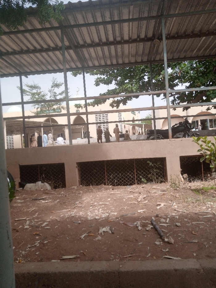 This image depicts an outdoor scene in Dandagoro, Nigeria, captured from beneath a metal-framed structure with a corrugated roof. In the foreground, the ground is bare earth, heavily littered with numerous fragments of wood, organic debris, and possibly animal bones. Below the partial view of the foreground structure, a raised concrete barrier runs horizontally, featuring multiple rectangular openings covered with chain-link or wire mesh. Beyond this barrier, in the midground and background, stands a light-colored mosque-like building. This structure features a light green dome on its left side and a visible crescent moon symbol atop a central finial. The building exhibits multiple arched openings and rectangular windows with vertical slats. On a paved area directly in front of the mosque, approximately eight to ten individuals are present. Some are dressed in white or light-colored robes, with at least one individual observed kneeling, suggesting prayer. Another group of individuals to the right appears to be standing and wearing darker attire. A dark-colored motorcycle is partially visible, parked near the right side of the building. Scattered trees with green foliage are visible in the background, under an overcast or hazy sky.