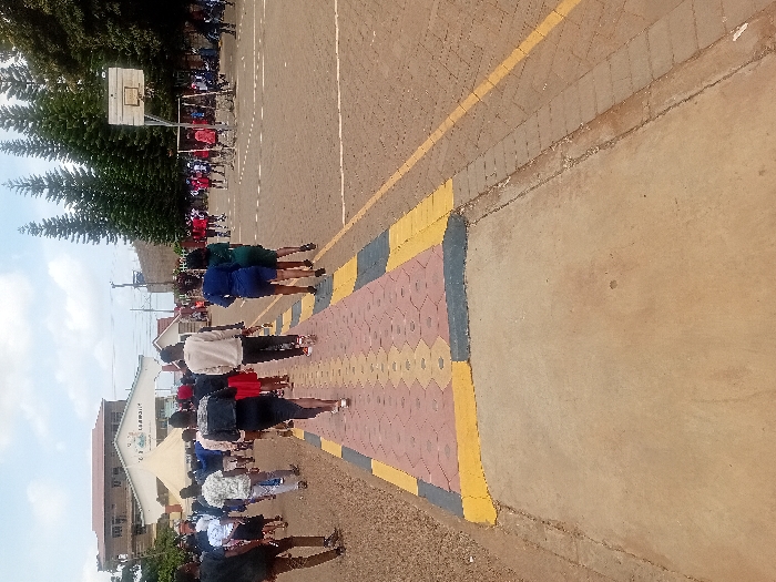 The image depicts an outdoor scene in Karingani ward, Kenya, featuring multiple individuals and structures under a partly cloudy sky. In the immediate foreground, a light-colored concrete path occupies the lower left. Adjacent to it, extending into the midground, is a patterned paver walkway composed of hexagonal blocks in red, yellow, and dark grey/blue, bordered by yellow and dark grey/blue lines. To the right of this walkway, a darker paved surface, marked with faint yellow lines, indicates a sports court. Approximately 15-20 individuals, predominantly young adults, are observed walking away from the camera, utilizing both the patterned paver walkway and the adjacent paved area. Notable individuals include a person in a black jacket and black skirt/dress centrally positioned on the paver path, a person in a light cream/beige long-sleeved shirt and dark trousers to their right, and two individuals in dark blue and dark green short dresses/rompers to the far right. All individuals are oriented in the same general direction, moving into the midground. On the right side of the midground, a basketball hoop with a wooden backboard and net is visible on the sports court. Further beyond, a metal goalpost with a net stands, suggesting a multi-sport facility. Additional people are present on the sports court, some wearing red attire, appearing to observe or engage in activities. In the background, a multi-story building with a reddish roof and light-colored walls is prominent on the left. Below this building, a large white tent with a peaked roof is erected. A partial sign on the building appears to read "LAAMALI." To the right, several tall, dark green coniferous trees are visible, behind which an earthen embankment or hillside is present. A utility pole with associated wiring is also visible on the left side of the midground.