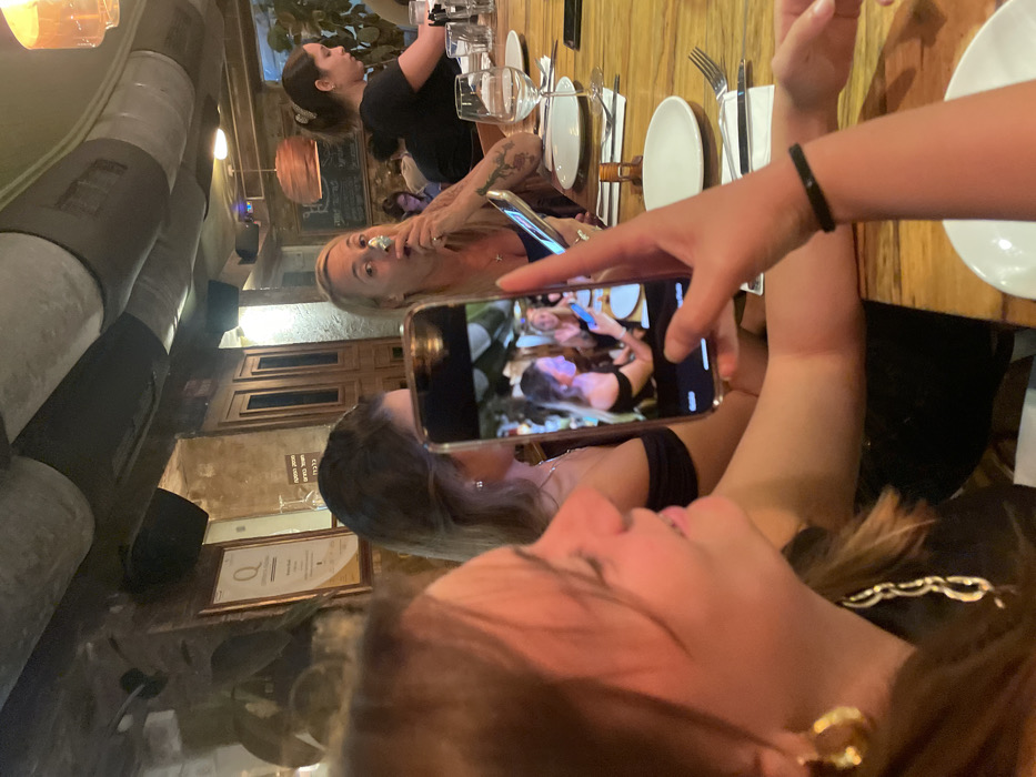 The image depicts an indoor scene within a restaurant or bar, located in the city of Unknown, Unknown. The establishment features exposed stone or rough plaster walls, a wooden ceiling with dark, exposed ductwork, and various light fixtures including a copper-toned pendant lamp. A framed document with a 'Q' logo and signage with Hebrew text, including "כשר" (Kosher), are visible on the left wall. In the foreground, a person's shoulder and the left side of their head are visible. This individual has brown hair, wears a gold hoop earring, and a gold-linked necklace. Their right hand holds a silver smartphone vertically, displaying an image on its screen. The image on the phone's screen shows two women seated at a table, both looking at a smartphone. To the immediate right of the foreground person, a young woman with brown hair, wearing a dark, off-shoulder top, is seated with her profile visible. To her right sits a blonde woman with tattoos on her left arm, wearing a dark top. This blonde woman is holding a spoon to her upper lip, looking directly towards the camera with an open-mouthed expression. A black smartphone rests on the wooden table near her. The table is set with white ceramic plates, silverware, clear stemmed wine glasses, and tumblers. In the background, other patrons are seated at various tables, including a woman with dark hair tied back, wearing a black t-shirt, visible on the far right. The overall lighting is dim, suggesting an evening setting.