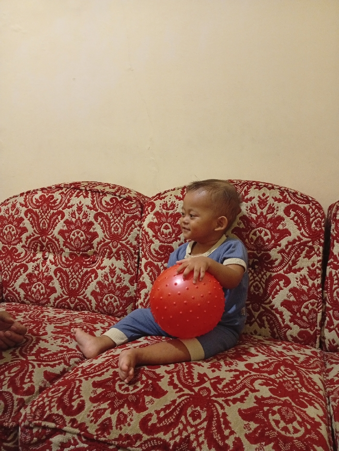 An infant or toddler is seated on a red and cream patterned sofa in an indoor environment. The child, dressed in a blue short-sleeved top and matching long pants with light cuffs, is barefoot and positioned centrally, facing left with a smile. A bright red, spiky spherical ball is held by the child on their lap. On the far left, a partial view of a human hand or forearm is visible on the sofa. The background consists of a plain, light beige wall. The location in the city of Kecamatan Pati, Indonesia, is not discernible from the image.