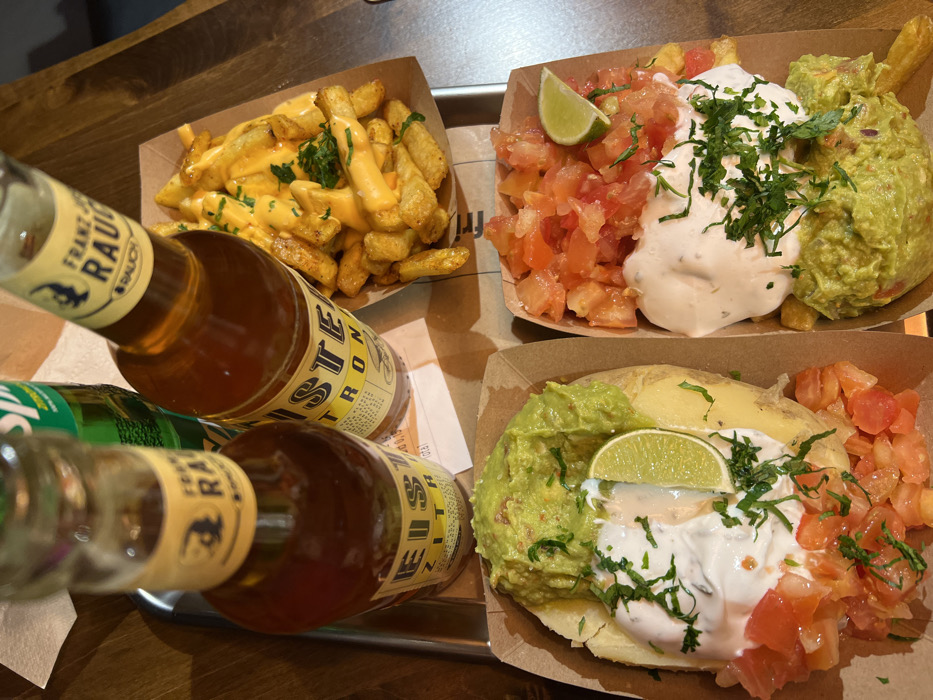 The image displays an overhead view of a casual meal set on a light brown wooden table, consistent with a dining establishment in Stuttgart, Germany. A metallic tray in the upper left holds three bottled beverages: two Franziskaner Natur Radler bottles, identifiable by their yellow labels with one clearly marked "Zitrone" (lemon), and one green Sprite bottle. A white paper, possibly a receipt, is partially visible beneath the bottles. Below the drinks, various food items are presented in brown cardboard containers. To the left, a baked potato (Kumpir) is split open and generously topped with a layer of guacamole, a dollop of white cream sauce, diced red tomatoes, and a lime wedge, garnished with chopped green herbs. Adjacent to it on the right, another container holds french fries similarly topped with guacamole, white cream sauce, diced red tomatoes, a lime wedge, and chopped green herbs. A third container, positioned above these to the right, contains french fries coated in a melted orange cheese sauce and sprinkled with green herbs. No individuals are visible in the frame.