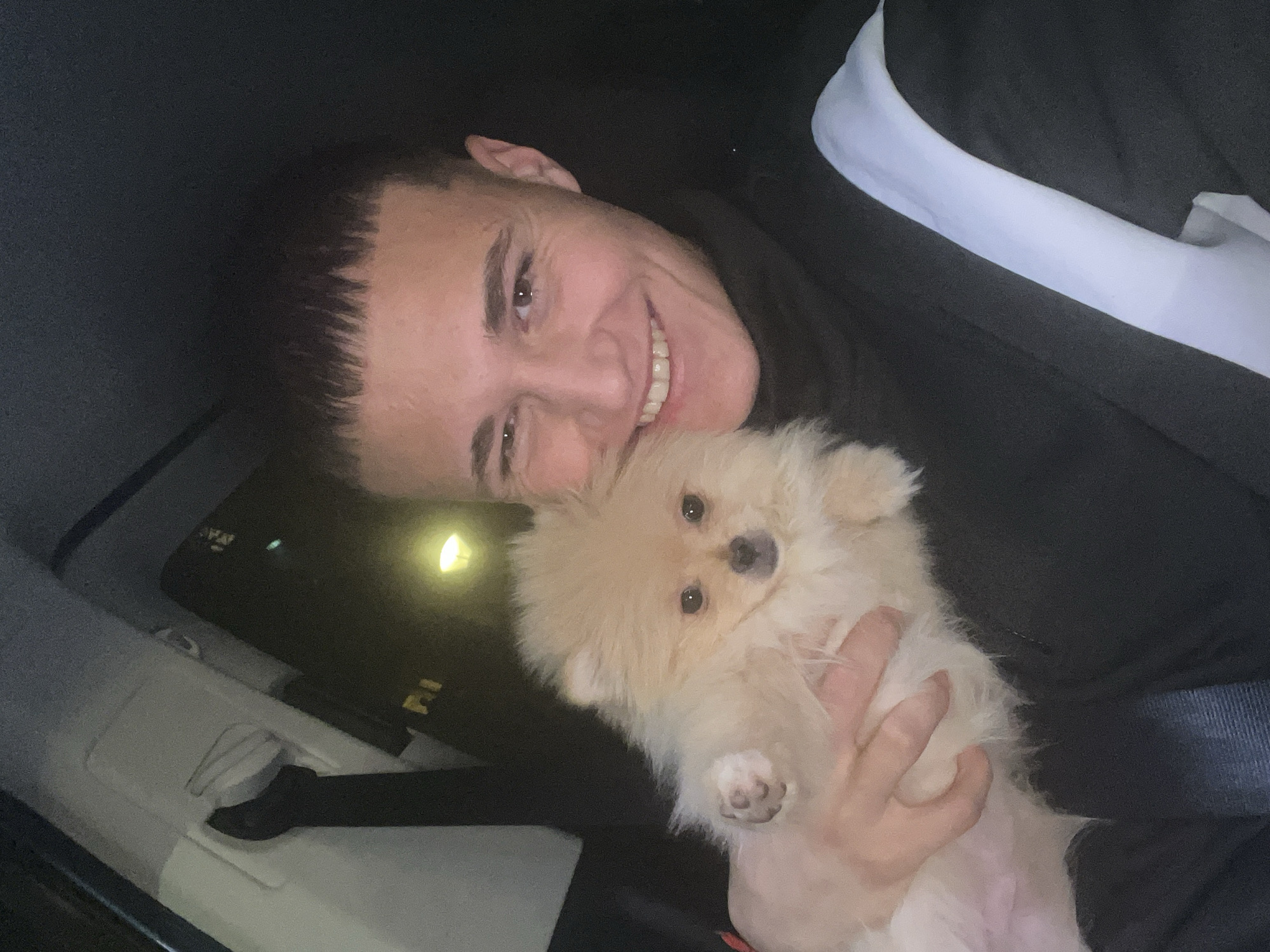 A young adult male is depicted in the foreground, seated within what appears to be a vehicle. He possesses short, dark hair with a distinct fringe, dark eyes, and a visible smile. He wears a black high-collared garment, with a light-colored strap positioned over his right shoulder. He holds a small, light-cream colored Pomeranian dog in his left arm, which faces the camera with dark eyes and a neutral expression. One of the dog's paws is visible near the male's forearm. The background consists of the vehicle's dark interior ceiling and a light-colored overhead console with a black seatbelt harness visible in the upper left. The lighting is low, indicating a nighttime setting. A diffused yellowish light source, likely external, is present in the upper right background. The specific location within the city of Botevgrad, Bulgaria, is not discernible from the visual information provided in the image.