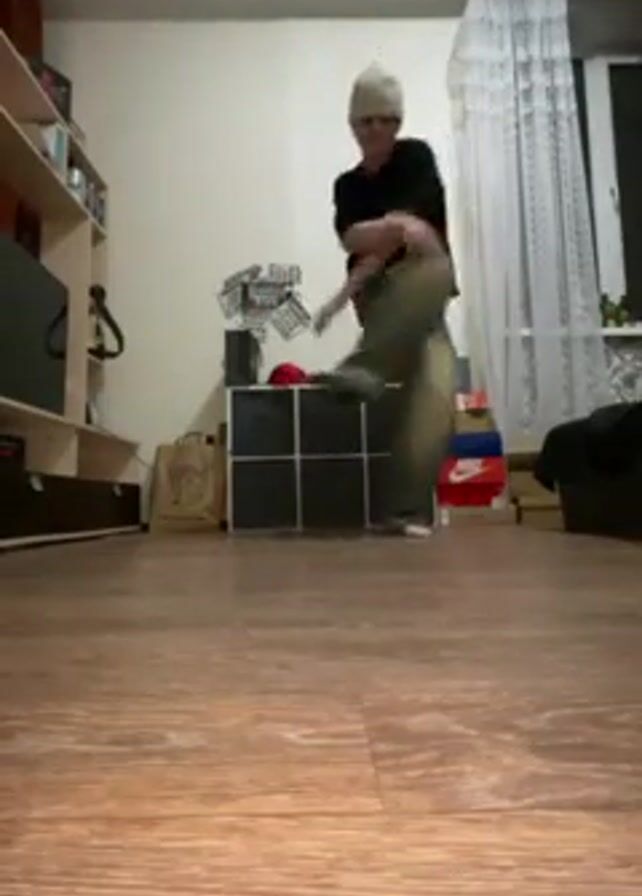 A male dancer performs breakdance moves on a wood floor in a room. He is wearing a black t-shirt, baggy jeans, and a white beanie. The room has built-in shelves, a window with curtains, a black storage unit, and several shoeboxes stacked in the corner. The lighting is bright, and the video captures the dancer's fluid movements as he spins, kicks, and balances on his hands. Music plays in the background.