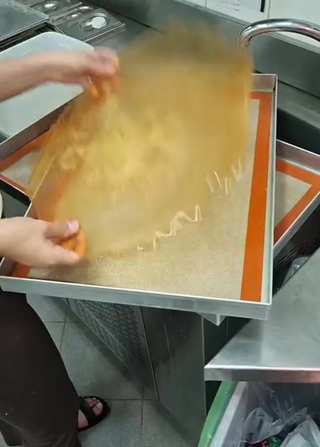 A person is shown breaking apart a large, thin sheet of brittle amber-colored candy. The candy is being broken over a rectangular metal baking tray lined with a silicone mat. The person is wearing dark pants and sandals and a bracelet. The scene appears to be in a commercial kitchen, with stainless steel surfaces and a sink visible in the background. There's also a wastebasket nearby. The brittle breaks easily, creating smaller pieces on the tray.