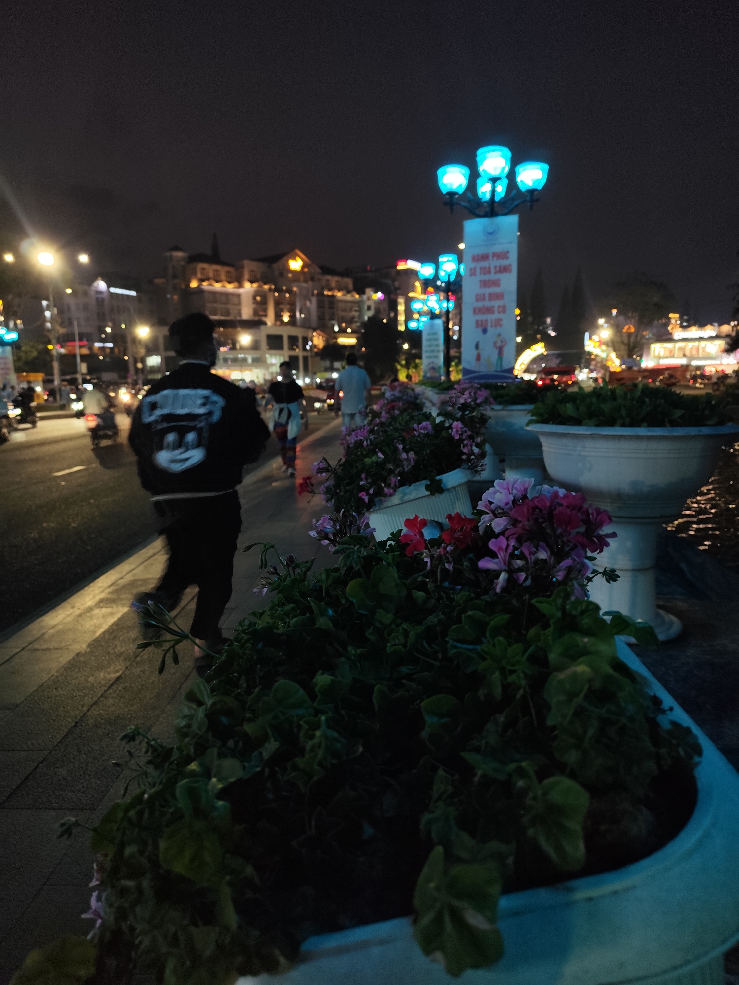 nighttime scene in what appears to be Da Lat, Vietnam. A man with a Mickey Mouse jacket is walking along the sidewalk next to a busy street with cars and motorcycles. In the foreground, there are potted plants with flowers. In the background, there are buildings lit up, streetlights, and light posts with blue glowing globes. A sign with Vietnamese writing stands prominently.