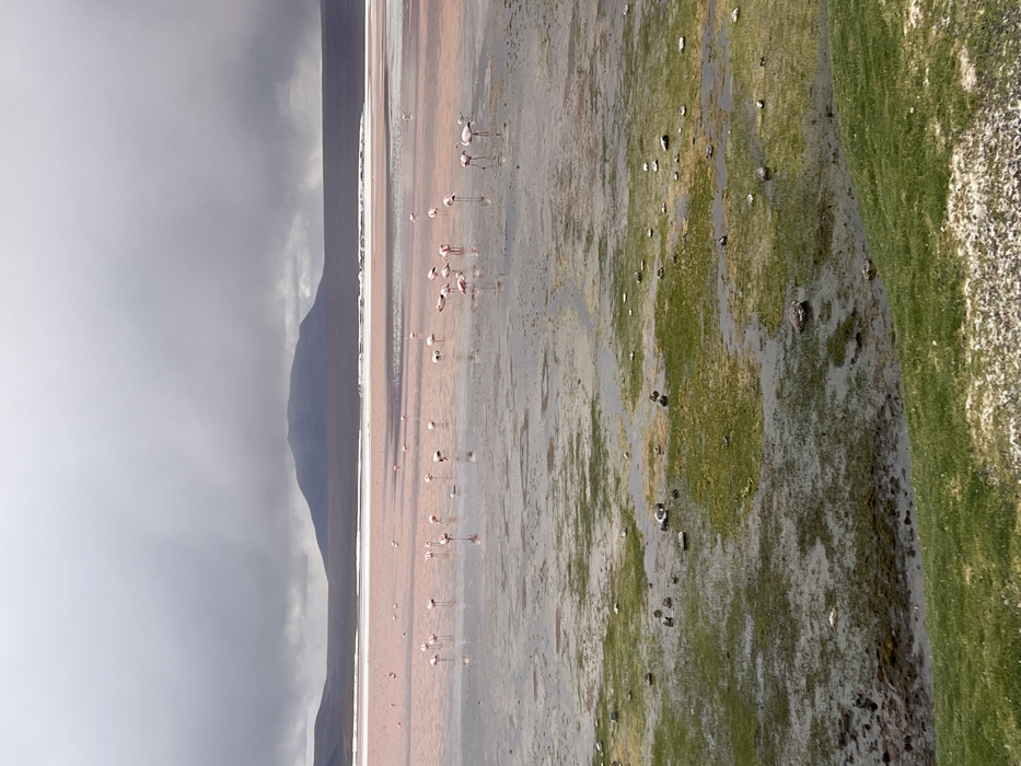 A landscape features a shallow lake reflecting a stormy sky with distant mountains. The water's edge is populated by numerous flamingos, their pink hues contrasting with the muted tones of the lake. Adjacent to the water is a muddy, grassy area with scattered rocks and vegetation, bordering a grassy verge. The overall scene evokes a sense of remote wilderness and tranquility despite the dramatic weather conditions.