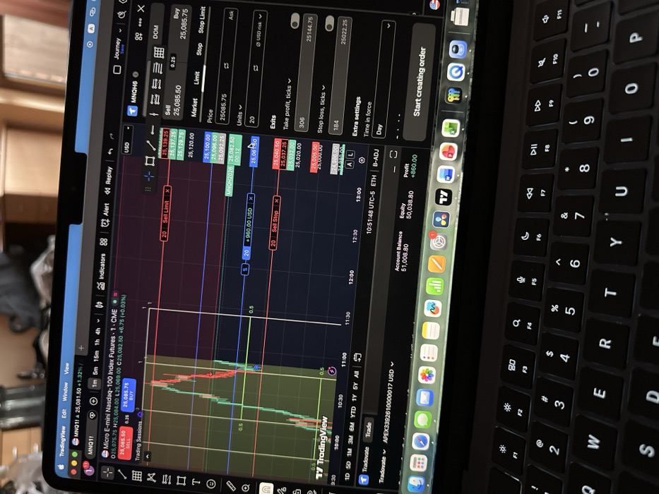 A dark-colored laptop, likely a MacBook, is shown from an elevated perspective, displaying its illuminated screen and a portion of its backlit keyboard. The screen presents a dark-themed financial trading platform, specifically TradingView, with an active Tradovate interface. The main display area features a candlestick chart for "MNQ1! Micro E-mini Nasdaq-100 Index Futures," depicting price fluctuations with green and red candlesticks, horizontal price level lines, and vertical time markers (e.g., 10:30, 11:00). Overlaid on the chart are indicators for "Sell Limit," "Sell Stop," and a trade position showing a profit of "+960.00 USD." On the right side of the screen, an order entry panel for "MNQH6" is visible, detailing options for "Sell" and "Buy" at specific prices (e.g., 25,085.50), with 20 "Units" selected, and exit parameters for "Take profit, ticks" (306) and "Stop loss, ticks" (184). The lower section of the screen displays Tradovate account information, including an "Account balance" of "51,008.80," "Equity" of "50,038.80," and a "Profit" of "+860.00," along with the current time "10:51:48 UTC-5." The laptop's macOS dock, populated with various application icons, is visible below the trading interface. The background is out of focus, indicating an indoor setting with hints of light-colored wooden furniture or surfaces and a soft, diffused light source, possibly from a window, originating from the upper right. No individuals are present in the image. The image lacks any specific visual identifiers to confirm the stated location of Dolni Bogrov, Bulgaria.