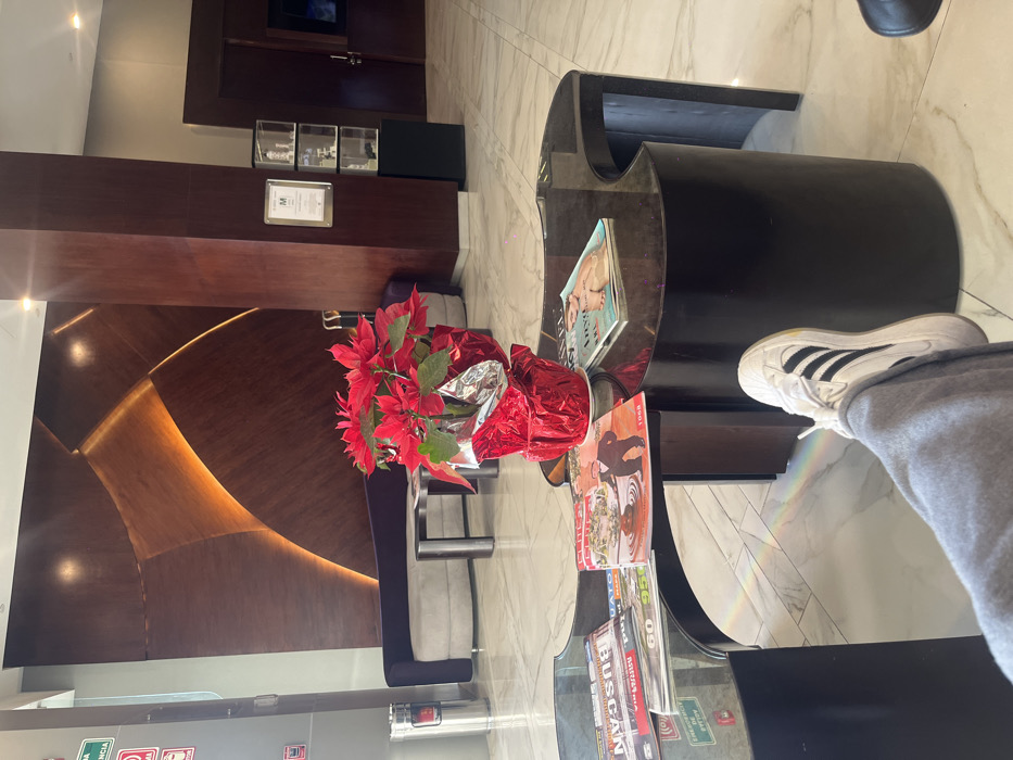This image depicts the interior of a modern hotel lobby, specifically identified as the Hotel Misión Express Irapuato, located at Blvd. Solidaridad #13900 Col. Lázaro Cárdenas, Irapuato, Guanajuato, México, based on visible magazine titles and hotel branding. The scene is viewed from a low perspective, showing the lower left leg of an individual wearing gray sweatpants and a white Adidas Superstar sneaker with black stripes, resting in the lower right portion of the frame. In the immediate foreground, a dark, irregularly shaped coffee table, likely made of wood or a dark composite material with a reflective surface, occupies the central space. On the table's left, a stack of magazines includes titles such as "BUSCAN" and "IRAPUATO." To the right, another magazine, "ANYEL," displays a person on its cover. A potted poinsettia plant with vibrant red bracts, wrapped in red metallic foil with a silver inner lining, sits centrally on the table. A subtle rainbow-colored light refraction is visible on the polished light-colored marble floor beneath the table. In the mid-ground, a curved, light gray upholstered sofa or bench is positioned against a wall, with a small, dark rectangular table in front of it. The primary background feature is a large, dark wooden wall panel with several curved, abstract segments, some of which are backlit with a warm, amber light. To the right of this feature, a substantial dark wooden pillar stands, bearing a silver-framed sign with a white background and a black "M" logo, consistent with the Hotel Misión brand. Adjacent to the pillar is a display case containing three glass shelves holding various small, indistinct objects. Further right, a dark wooden door is partially visible. On the far left, a silver trash receptacle and a white sign with green "SALIDA" (Exit) text and a green arrow, along with red "EMERGENCIA" (Emergency) text, are affixed to a light gray wall. The floor throughout the lobby is composed of polished light-colored marble or tile with a subtle veining pattern. Overhead, recessed lighting illuminates the space. No other individuals are visible.