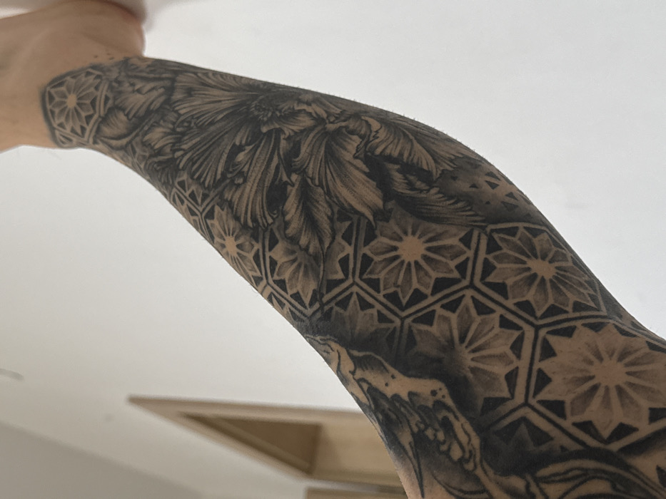 The image displays a close-up, eye-level view of a human right forearm and wrist, fully adorned with a black and grey tattoo