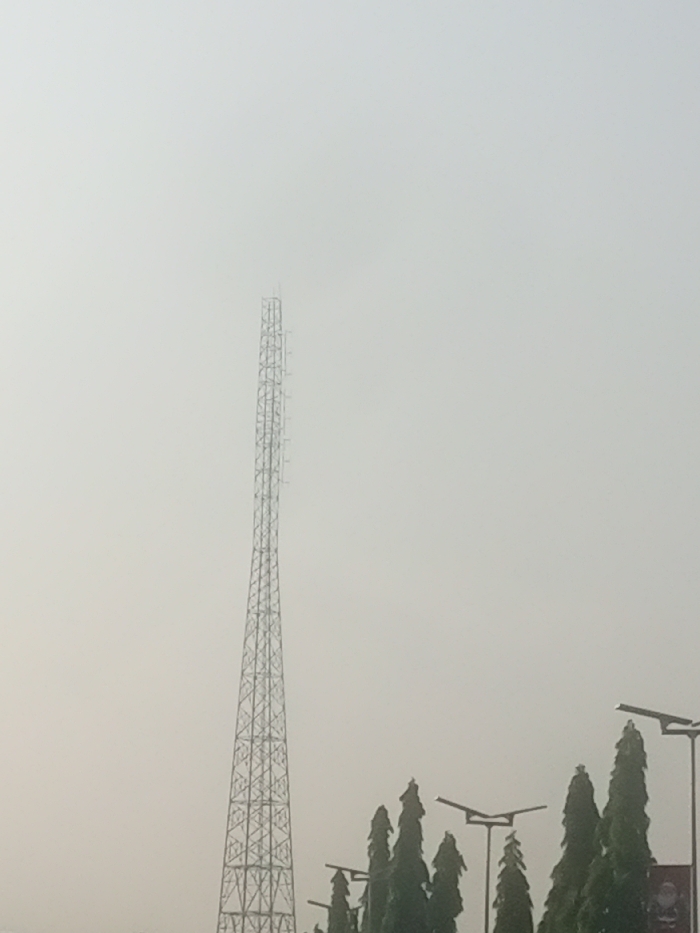 An overcast day obscures the background. A tall, thin, steel lattice telecommunications tower stands prominently on the left. Evergreen trees and streetlights line the lower right. The hazy atmosphere reduces visibility, blending the objects with the sky.