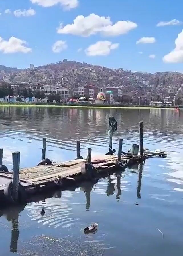 lake under a blue sky with white clouds. In the foreground, there is a wooden pier with several old tires attached to its side. In the water near the pier, a few ducks are swimming. Behind the pier, the opposite shore of the lake is visible, covered with buildings climbing up a hillside. Further into the video, a man dressed as Spiderman appears on the pier next to several small boats, including a swan-shaped paddle boat. Other boats are visible on the lake in the background. There is also a water fountain visible in the distance.