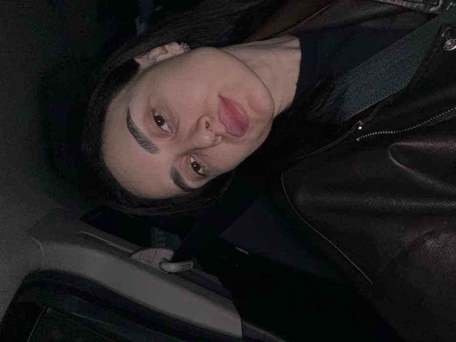 A person with brown hair and eyebrows, wearing a dark brown leather jacket and a black shirt, is seen from a low angle inside a car. They are wearing a seatbelt and sticking out their tongue. The car door and handle are visible. The image is dimly lit, making the colors appear muted.