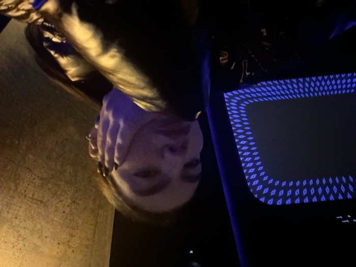A woman rests her hand on her face, her eyes looking directly at the camera. She has dark hair and is wearing a dark jacket. To the right is a rectangular surface framed with a repeating pattern of small, blue diamond shapes. The background is dark, with a textured, light-colored surface to the left. The image is presented upside down.