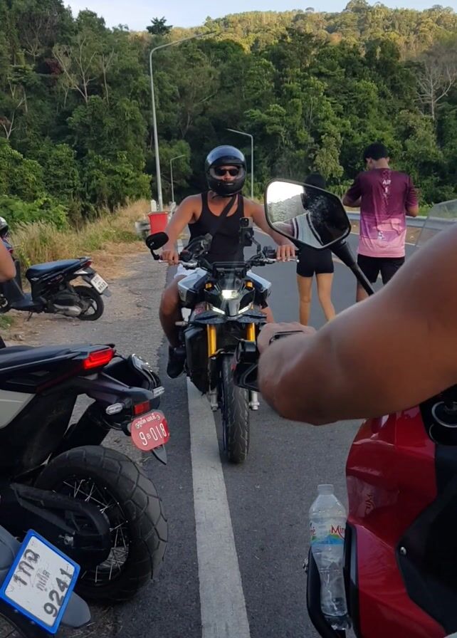 A man wearing a black tank top, sunglasses, and a helmet sits on a black and yellow motorcycle on a road. He is looking directly at the camera and giving a thumbs up. Other people and motorcycles are also present on the road. The surroundings consist of lush green trees and a clear sky. The video appears to be shot from the perspective of another person on a motorcycle. The license plates on the motorcycles indicate they are from Cambodia.