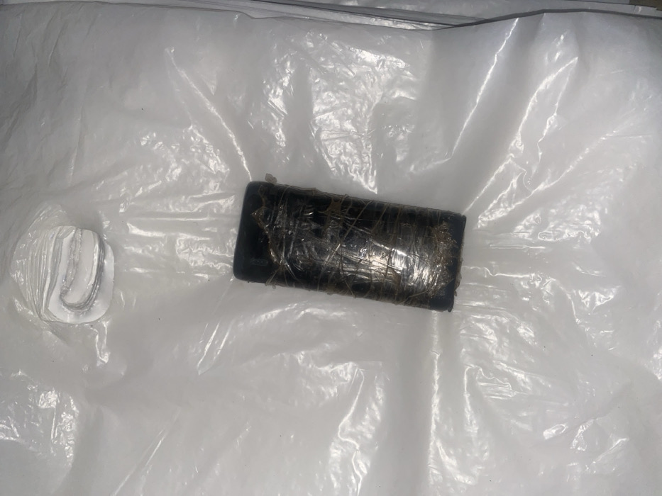A rectangular, dark-colored object tightly wrapped with clear tape sits on a crinkled, translucent surface. Beside it, a stack of white, crescent-shaped objects is visible. The scene suggests a sterile environment, likely indoors. The overall impression is one of containment and concealment.