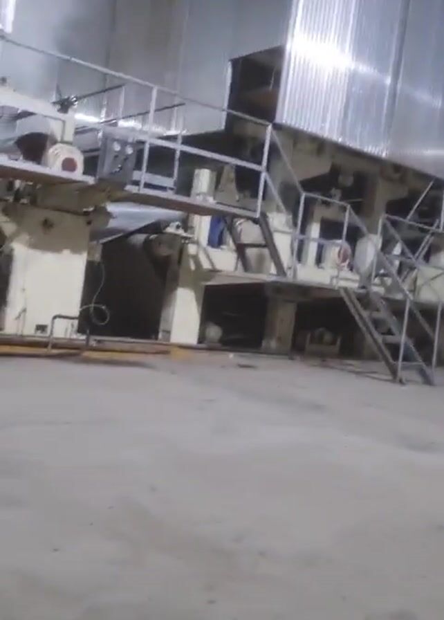 The camera pans across the interior of a factory, focusing on a large, multi-tiered piece of machinery