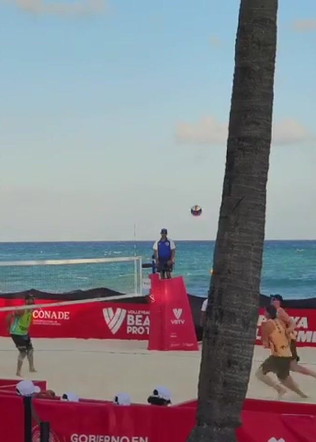 Here is a concise description of the video. **Setting:** The video is taken on a beach, likely a tournament setting as evidenced by the branded barriers and a referee on a raised platform. The ocean is visible in the background under a partly cloudy sky. A palm tree trunk is centrally positioned in the frame. **People:** There are several individuals present. Two teams of two men are playing beach volleyball. There is also an official standing on a raised platform officiating the game. Several other individuals are observing along the perimeter of the court. **Objects:** Key objects include the beach volleyball net, the volleyball itself, branded red barriers surrounding the court, a palm tree trunk, a sign with text on it, and the ocean. **Actions:** The central action is a beach volleyball game in progress. Players are jumping, hitting the ball, and running across the sand. The referee is observing the play. **Interactions:** The volleyball players are interacting with each other as teammates, and with their opponents as they compete for points. The referee is interacting with the players by overseeing the game.