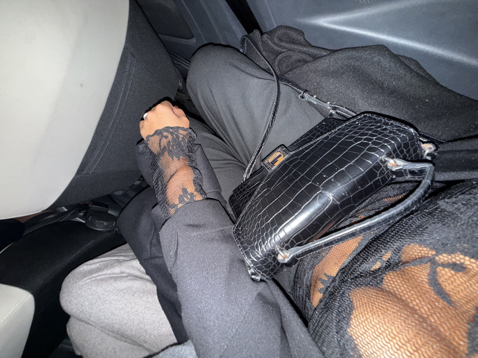 The image depicts the interior of a car, focusing on the legs and torso of a person. The individual wears black trousers and a black top with a lace overlay. A black crocodile-patterned purse rests on the person's lap. A black coat or jacket is draped nearby. Part of a car seat is visible on the left side of the frame. The overall lighting suggests an evening or dimly lit environment.
