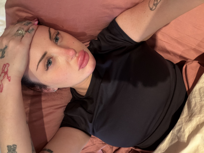 A woman with fair skin and blue eyes lies on her back in bed. She wears a black t-shirt, and her arm is raised with her hand on her forehead. Tattoos are visible on her arms and hands. She has full lips and prominent cheekbones. The bedding is a mix of pink and white. The lighting in the room is soft, creating shadows and highlighting her features.