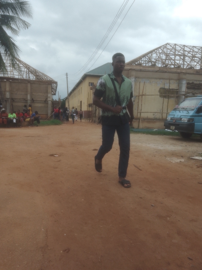 The image depicts an outdoor scene within the city of Nsugbe, Nigeria, under an overcast sky. A male individual, appearing to be an adult, walks towards the viewer on a reddish-brown unpaved road. He wears a light green short-sleeved collared shirt with a dark pattern, dark blue trousers, and dark open-toed sandals. A dark strap, likely from a bag, crosses his chest from his right shoulder. To the left of the road, a group of approximately ten to fifteen individuals is gathered, some seated on a low structure, dressed in various casual clothing. Behind them, an unfinished building with concrete walls and an exposed wooden truss roof structure is visible. Palm fronds extend into the frame from the far left. On the right side of the road, a light blue van is parked or stationary. Behind the van, another building also features an exposed wooden truss roof structure, indicating ongoing construction. Further into the background on the right, a long, two-story yellowish-brown building with a green roof is present. Utility poles with overhead power lines span across the scene. Additional individuals are visible walking further down the dirt road in the distance.