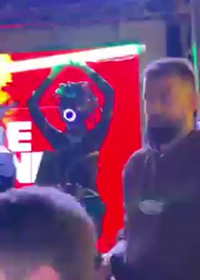A robot-like figure in black with a glowing white circle on its face dances on a platform, holding illuminated bars. The background shifts colors from red to yellow. People stand around watching. One man with a beard is visible in the foreground. The scene appears to be at a party or performance.