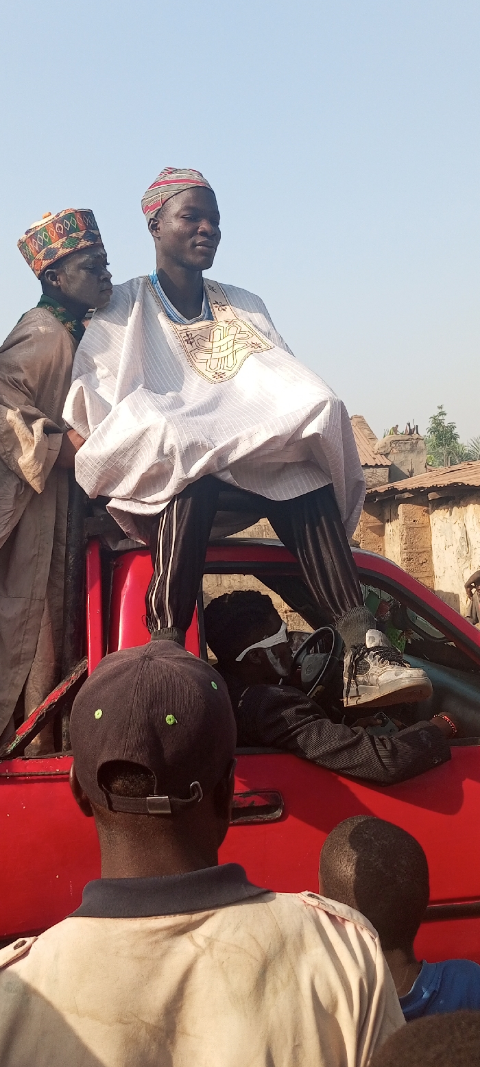 An outdoor scene in Doma, Nigeria, depicts multiple individuals gathered around a red pickup truck or SUV under a clear, light blue sky. The central figure, a young adult male with dark complexion, is seated atop the red vehicle, facing slightly right of the camera. He wears a striped cap, a white long-sleeved garment with intricate gold and brown embroidery, and dark track pants with white stripes. Faint scarification marks are visible on his right cheek. To his left, an older adult male with dark complexion stands partially obscured, wearing a tan robe and a multi-colored embroidered cap. His face displays dark markings or paint, especially around the eyes and cheeks. He is looking towards the central figure. Inside the red vehicle's driver's seat, a young adult male with dark complexion is visible. He wears dark clothing and a white blindfold or eye covering. His left foot, clad in a grey and white sneaker, rests outside the vehicle near the window frame. His right hand is on the steering wheel. In the immediate foreground, two individuals are seen from behind. One wears a black baseball cap with green stitching and a light-colored collared shirt with a dark collar. To his right, a second individual, partially visible, has short dark hair and wears a blue shirt. The background reveals a residential area with buildings featuring corrugated metal roofs and walls constructed from mud-brick or plaster. Vegetation, including a small tree, is also visible. The overall lighting indicates daylight conditions.