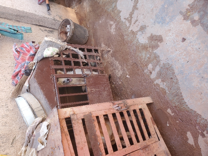 Two rusty, barred cages are stacked near a textured concrete wall. One cage contains a light-colored dog visible through the bars. Beside the cages are various items, including a red and white patterned cloth, white cloth, and a bucket. The area appears cluttered and in need of cleaning.