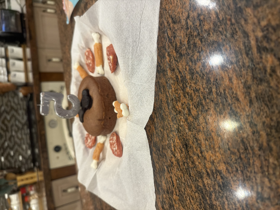 The scene depicts a small, dark brown, round cake with a silver-colored candle shaped like the number "5" embedded in its center. Dark residue, likely melted wax, is visible at the candle's base. The cake is positioned on a crumpled white paper napkin, which also holds an assortment of pet treats. These treats include several irregularly shaped, reddish-brown pieces resembling sliced sausage or pepperoni, and multiple elongated, light orange sticks with white rounded ends, suggestive of miniature bones or drumsticks. One small, white and orange/brown paw-print shaped treat is also visible near the cake. This arrangement rests on a glossy countertop, characterized by its speckled dark brown and black coloration. The background is out of focus, revealing a kitchen environment with light-colored cabinetry, a dark patterned backsplash, and various kitchen items. No individuals are present. The location is a domestic setting in Samoranovo, Bulgaria.