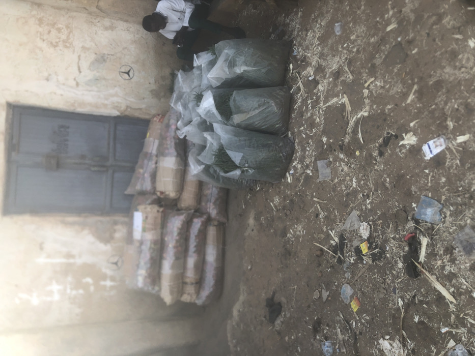 The image depicts an outdoor scene in Kufena, Nigeria, characterized by a dirt ground heavily littered with plastic debris, paper, and wood shavings. In the background, a weathered building with light-colored, possibly stucco or mud, walls features a closed, grey/blue double metal door secured with a padlock. A black Mercedes-Benz logo is spray-painted on the wall to the right of the door and faintly on the left. To the left of the door, two stacks of packaged goods are visible. The lower portions consist of rectangular bundles wrapped in light-brown material and secured with tape. Above these, and to the right of the left stack, are clear plastic bags containing numerous reddish-brown, spherical items, likely produce. In the mid-ground, a cluster of approximately 10-12 large, translucent white/grey plastic bags rests on the ground, each filled with dense green leafy material. To the far right, a male individual wearing a white long-sleeved shirt and dark trousers is seated on a raised ledge against the wall, looking down at and interacting with a small object, consistent with a mobile phone, held in his hands. The scene suggests a commercial or storage area with goods awaiting transport or sale.