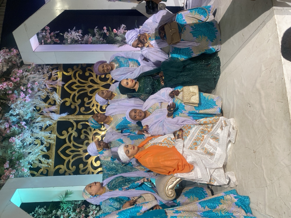 Seven women are posing indoors for a photo, seated or leaning against each other in an arranged display. They wear an array of colorful traditional clothing. One woman is in a green outfit, while another dons an orange head covering. Most have on a blue and white patterned fabric. The backdrop features flowers and a gold, ornate screen or wall.