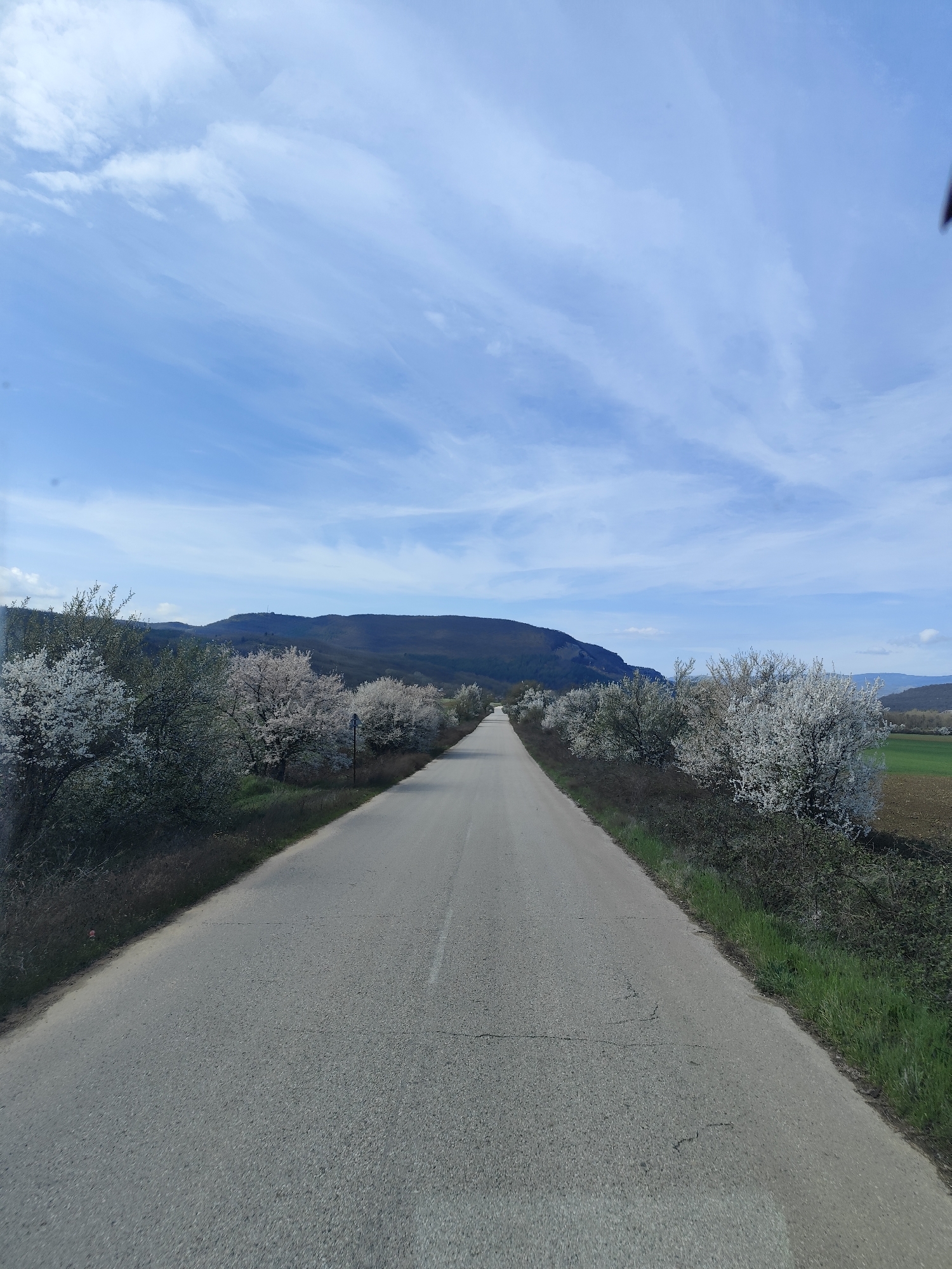 The image depicts a straight, paved road leading towards a distant, dark, forested hill under a blue sky with scattered white clouds. The road is flanked on both sides by flowering trees with white blossoms, suggesting spring. To the right of the road, there is a patch of green and brown field. The location is Kotlari, Bulgaria.