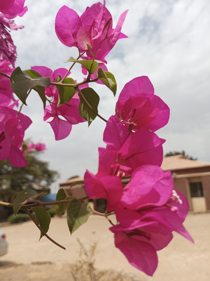 The image displays a close-up perspective of bright magenta bougainvillea flowers, sharply in focus, against a blurred background in Jos, Nigeria. Clusters of these pink bracts, interspersed with small green leaves and faint white true flowers, occupy the majority of the foreground and mid-left. In the soft-focus background, the sky is predominantly cloudy with white and grey formations. Below the horizon, two low-rise buildings are partially visible; one to the right features light-colored walls and a reddish-brown hip roof. The ground appears to be a light brown, possibly unpaved surface, with scattered dry vegetation. A portion of a white vehicle is discernible on the far left of the midground. Out-of-focus green tree foliage is present on the left horizon.