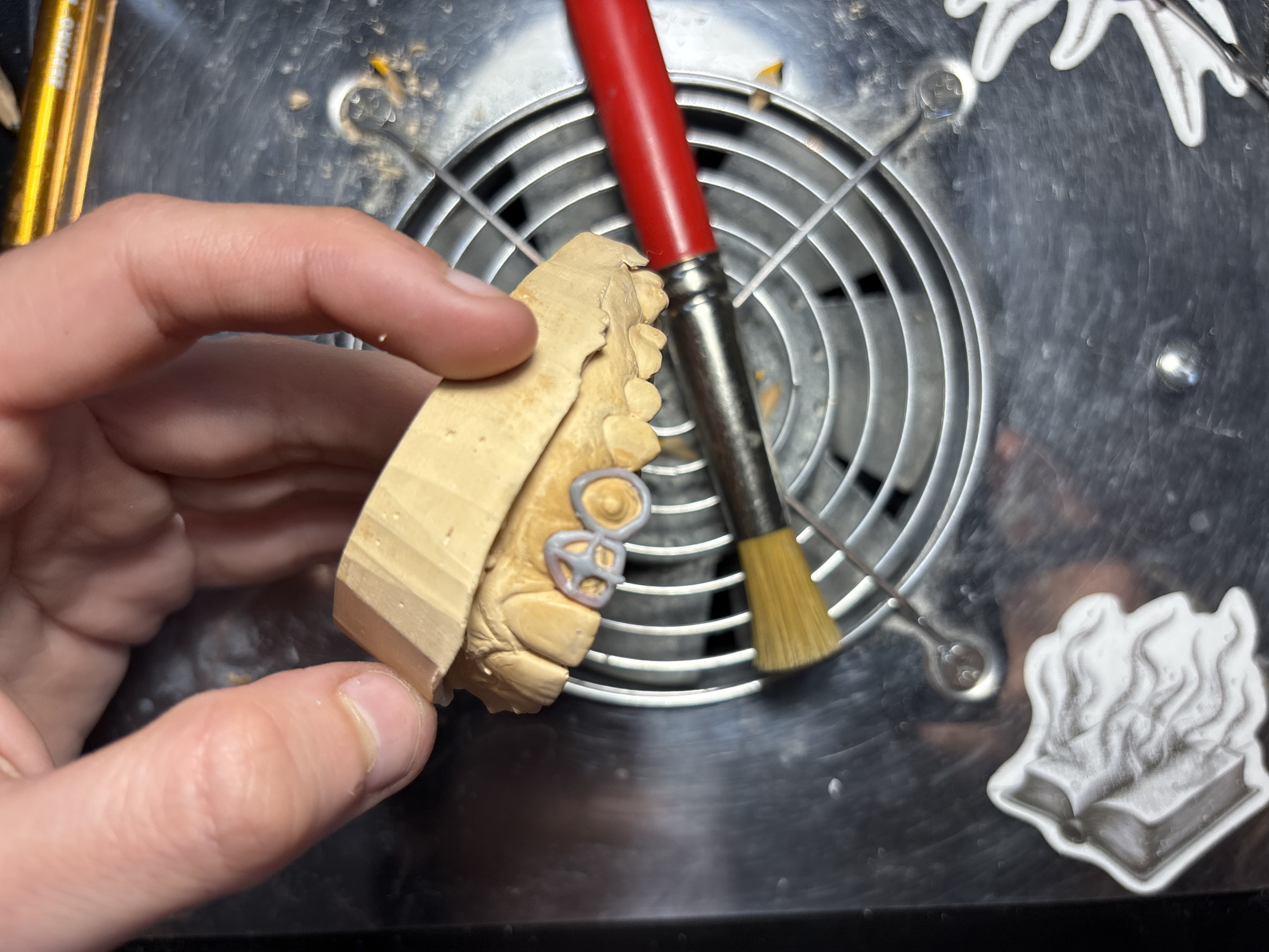 A hand holds a dental model with metal framework. A red-handled brush rests near the model. The scene takes place on a metallic surface with a circular grill. A sticker depicting a book with flames is on the surface. It is not possible to infer the location in the city of Sofia, Bulgaria.