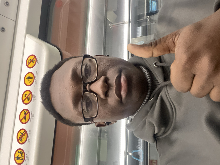 A man wearing glasses and a gray hooded sweatshirt poses on public transportation. The man is giving a thumbs-up. The interior of the train car includes signage with pictograms indicating various rules and regulations for passengers, and a window with bars. The man's face is the focal point, and his expression appears neutral.