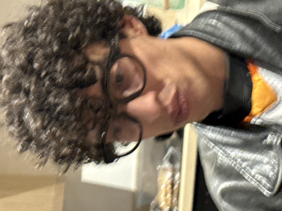 The image displays a close-up, chest-up portrait of an individual in an indoor setting located in Saint-Denis, France. The subject is an adult male with dark, tightly curled hair that frames his face. He is wearing dark-rimmed, circular eyeglasses. His facial expression shows pursed lips, slightly protruding in a 'pout'. He is dressed in a dark, potentially grey or black, jacket with a textured, possibly leather-like, finish. Beneath the jacket, a dark garment is visible, which in turn covers an article of clothing featuring a distinct orange and white V-shaped pattern at the chest. A light blue element is visible near the right side of his neck, extending slightly from behind his ear. The background is out of focus, indicating a shallow depth of field, and shows indistinct light-colored surfaces and blurry objects that resemble stacked items or food packages on a counter to the left. The lighting is artificial and consistent with an interior environment.