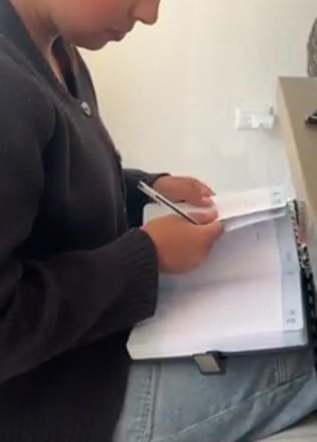A woman with dark hair, wearing a brown sweater, is sitting cross-legged and looking down at an open planner on her lap