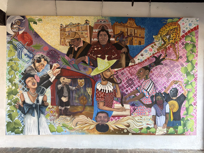 A vibrant mural depicts a cultural tapestry