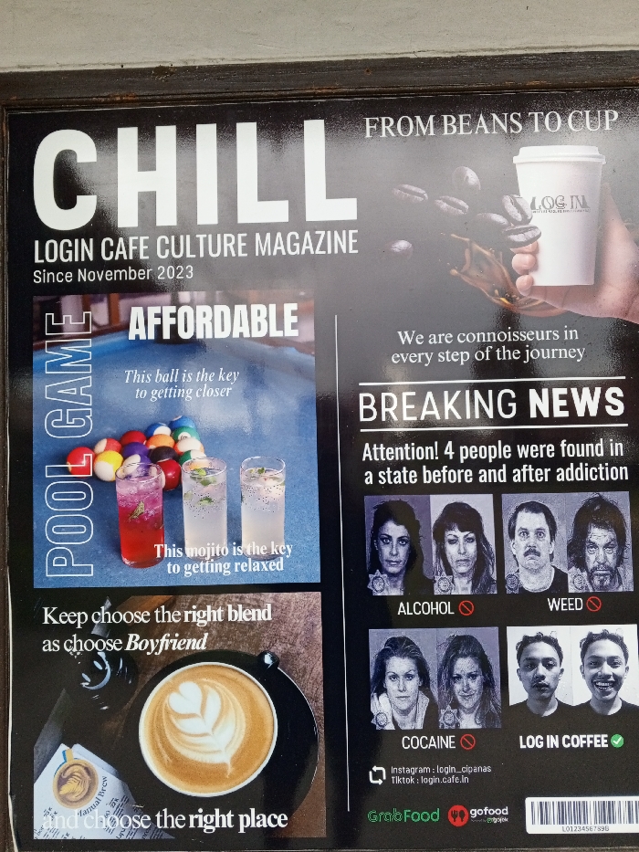 This image displays a framed, glossy rectangular poster acting as a sign for "CHILL LOGIN CAFE CULTURE MAGAZINE, Since November 2023", affixed to a light-colored wall in Voa Yeav, Cambodia. The poster is divided into multiple sections: 1. **Top Left:** "CHILL" in large white lettering with "LOGIN CAFE CULTURE MAGAZINE Since November 2023" below it. 2. **Top Right:** "FROM BEANS TO CUP" and an image of a hand holding a white coffee cup with the "LOGIN" logo, surrounded by scattered coffee beans. Below this is the text "We are connoisseurs in every step of the journey". 3. **Mid-Left:** A vertical text column reads "POOL GAME". This section also features a horizontal panel labeled "AFFORDABLE". Within this panel are two images: a rack of multi-colored billiard balls on a blue felt table, with the text "This ball is the key to getting closer", and three tall glasses containing beverages (one red, two clear with mint leaves) with the text "This mojito is the key to getting relaxed". 4. **Bottom Left:** A dark-toned image shows an overhead view of a black coffee cup with latte art (a heart design) on a black saucer, next to a small white paper coaster. Accompanying text reads "Keep choose the right blend as choose Boyfriend and choose the right place". 5. **Right Column (Breaking News):** This section is titled "BREAKING NEWS" and states "Attention! 4 people were found in a state before and after addiction". It presents three pairs of mugshot-style images illustrating the "before and after" effects of substances: * "ALCOHOL": Two female individuals, one appearing healthier, the other exhibiting signs of degradation. * "WEED": Two male individuals, one appearing healthier, the other exhibiting signs of degradation. * "COCAINE": Two female individuals, one appearing healthier, the other exhibiting signs of degradation. Below these, a final pair of images labeled "LOG IN COFFEE" displays two male individuals, both appearing healthy and smiling, contrasting with the addiction examples. 6. **Bottom Right:** Social media handles "Instagram: login_cipanas" and "TikTok: login.cafe.in" are listed. Below these are logos for delivery services "GrabFood" and "gofood". A barcode and the alphanumeric code "L0123456789B" are present at the very bottom. The poster's surface shows minor reflections. The framing is a dark brown or black material, possibly wood or metal.
