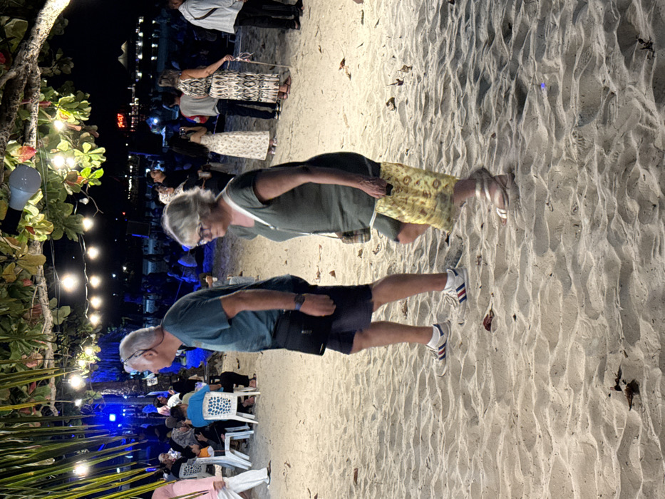 The image depicts a nighttime scene on Cenang Beach, Malaysia. In the foreground, two elderly individuals are walking left across the sandy terrain. The man, with short grey hair, wears a teal short-sleeved shirt, dark shorts, white athletic shoes with red and blue stripes, and a black messenger bag slung across his body. The woman, with grey hair and glasses, wears a dark olive-green short-sleeved shirt, a patterned yellow reusable shopping bag in her right hand, and light-colored sandals. The sand beneath them shows ripples and scattered small dark objects, possibly leaves or debris. In the midground and background, numerous other people are present. To the left, a group is seated at white plastic tables with chairs under a blue light source, suggesting an eating or gathering area. Further back, more people are seated directly on the sand. Overhead, string lights with incandescent bulbs are suspended from tree branches, providing illumination for the scene. A solitary light fixture with a blue shade hangs from a branch directly above the main subjects. In the far background, additional lights from buildings or other structures are visible against the dark sky, including a red illuminated sign that reads "THE V". On the right side of the midground, several individuals are standing, including a woman in a long patterned dress holding what appears to be a walking stick or cane, and another woman in a light-colored long dress holding a phone, possibly capturing a photograph. The overall atmosphere is that of a lively evening social gathering on the beach.